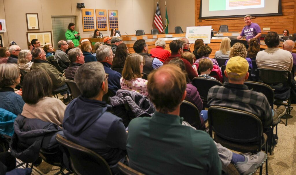 There was a good turnout of community members at the Save Issaquah Light Rail Community Meeting on February 24th. Council chambers were filled to capacity, and City Council Members were present as part of a Special Council Meeting (called whenever more than three attend an event per public disclosure R.C.W.).